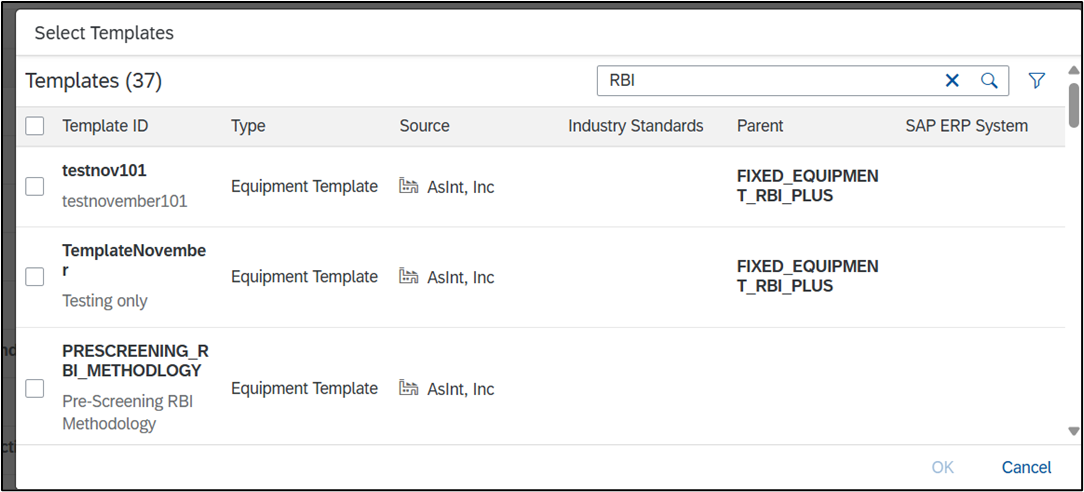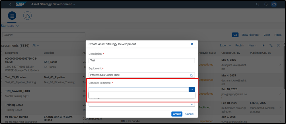 The issue occurs when the Checklist Template is not linked to the selected Equipment in Master Data. By Adding the appropriate template under the Equipment's datasheet resolves the issue and enables template selection during assessment creation in ASD.